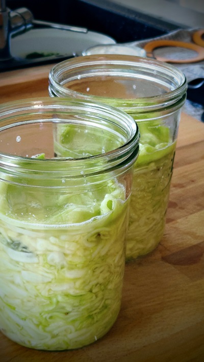 Finir par une demie feuille pour couvrir le chou râpé. Bien recouvrir de liquide salé en appuyant fort. Fermer les bocaux et les laisser attendre dans le noir (sur une assiette au cas où ça déborde).
